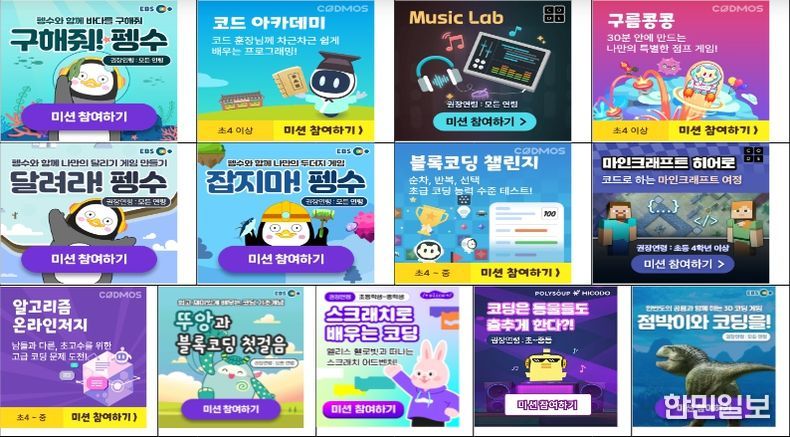 특히, 이번 ‘2024 온라인 코딩파티 시즌1’에서는 9개의 전문기관들의 적극적인 참여로 역대 온라인 코딩파티 중 가장 많은 32개 프로그램을 선보일 예정이며, 미국의 비영리 교육기관인 코드닷오알지의 ‘Music Lab’과 한국교육방송공사의 인기 캐릭터인 펭수가 등장하는 ‘도와줘! 펭카페’ 프로그램이 신규 공개된다.