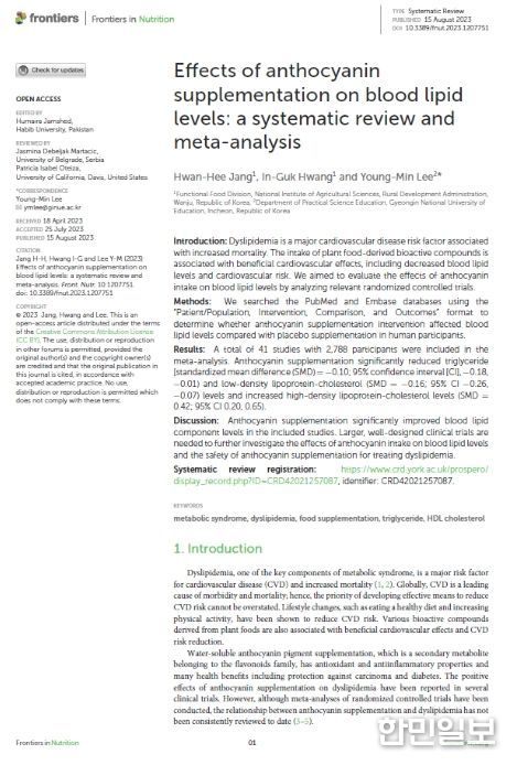 연구진은 안토시아닌 섭취 관련 연구 결과들을 종합해 최종적으로 안토시아닌 효과를 검증했다. 2023년 6월까지 보고된 안토시아닌 관련 국내외 임상 연구 336건 중 지질개선 효과를 확인한 연구 41건(총 2,788명 참여)을 대상으로 했다.