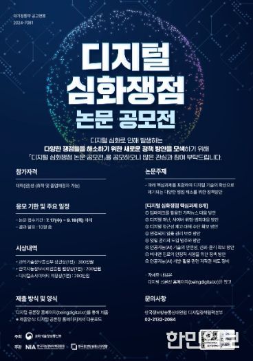 올해 처음 개최되는 디지털 심화쟁점 논문 공모전은 지난 5월 21일 국무회의에 보고된 ‘새로운 디지털 질서 정립 추진계획’의 8대 핵심과제 중 하나를 선택하여 자유롭게 정책 방안을 제시하는 것을 주제로 한다. 디지털 심화쟁점에 관심이 많은 대학(원)생을 대상으로 하며, 논문 공모전의 접수 마감일은 9월 19일까지이다. 최우수작과 우수작에 한해 발표회도 진행될 예정이다.