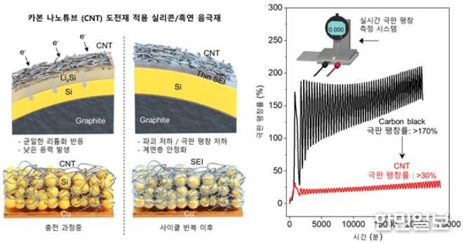 이 연구 결과로 기존 카본블랙(Carbon Black, CB) 기반 도전재에서 나타나는 170%의 극판 팽창에 비해 CNT를 사용한 실리콘 전극에서는 27% 정도의 매우 낮은 팽창률을 보임을 확인했다.