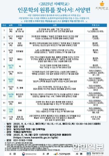 한민일보 서울포커스 유현민 기자 | 하남시는 문화체육관광부가 주최하고 한국문화예술위원회가 주관하는 ‘2025년 도서관 지혜학교’ 공모사업에 하남시일가도서관의 2개 프로그램이 선정돼 국비 2천만 원을 확보했다고 밝혔다. 이에 따라 하남시일가도서관은 오는 9월부터 시민들에게 깊이 있는 인문학 강연을 선보인다.