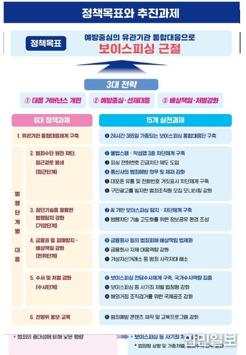 이에 정부는 지난 8월28일 국무조정실 주관의 범정부 전담반(T/F) 회의를 개최하여 ‘사기전화(보이스피싱) 근절 종합대책’을 발표하고, 범죄 수단을 확보하는 단계에서 피해자에게 금전 탈취를 시도하는 단계까지 사기전화(보이스피싱) 범죄가 이루어지는 전 단계에 걸쳐 사기전화(보이스피싱) 근절을 위한 15대 실천과제를 발표하였다.