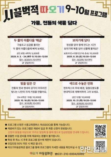한민일보 서울포커스 유현민 기자 | 시흥시 따오기아동문화관이 9월부터 10월까지 ‘전통’을 주제로 한 특별ㆍ상설프로그램을 운영한다. 이번 프로그램은 최근 흥행 중인 애니메이션 케이팝 데몬 헌터스의 인기로 높아진 전통문화 관심과 맞물려, 깊어 가는 가을에 아이들과 가족이 함께 우리 문화의 아름다움을 체험할 수 있도록 마련됐다.