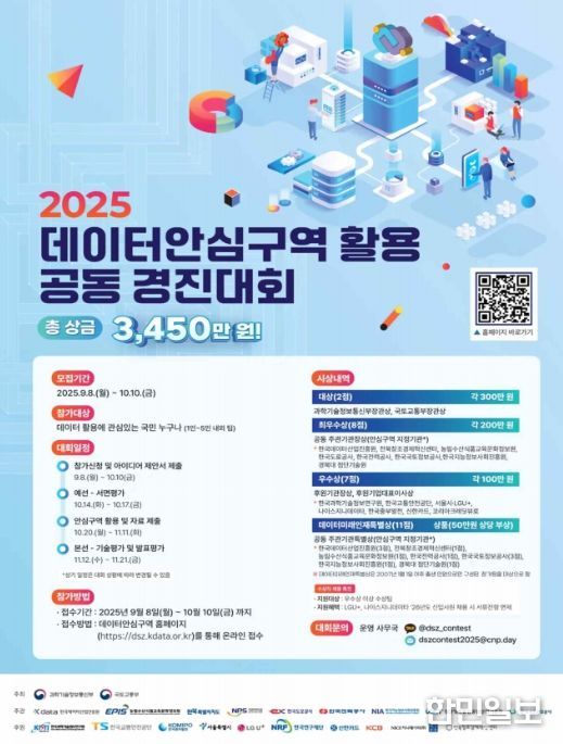 한민일보 서울포커스 기자 | 과학기술정보통신부와 국토교통부는 ‘2025년 데이터안심구역 활용 공동 경진대회’ 참가신청을 9월 8일부터 10월 10일까지 접수한다.