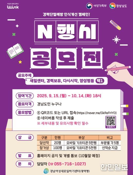 김민영 경남새일센터장은 “N행시 짓기 공모전은 경남도민이 직접 참여하여 여성 경제활동 및 경력유지의 중요성을 표현하는 캠페인으로, 이번 공모전을 통해 여성 친화적인 근로문화 조성에 도움이 되길 바란다”라고 밝혔다.