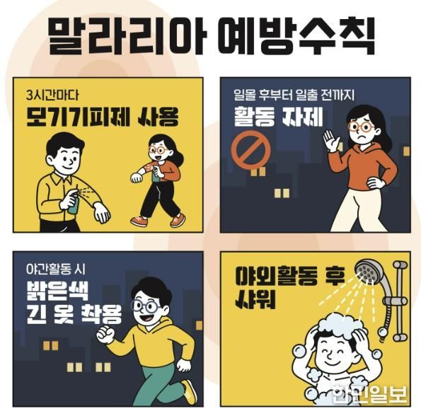 말라리아 예방을 위해서는 무엇보다 모기에 물리지 않는 것이 중요하다. 외출 시 밝은색 긴팔·긴바지를 착용하고 휴대용 모기 기피제를 지참해 주기적으로 사용하는 것이 좋다. 취침 시에는 모기장을 활용하고 방충망을 점검하며 모기의 실내 유입을 막아야 하며, 집 주변 고인 물을 제거해 모기 서식지를 없애는 것도 필요하다. 이러한 생활 속 예방수칙을 꾸준히 실천하는 것이 말라리아 발생을 줄이는 가장 효과적인 방법이다.