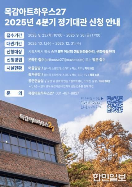 신청 대상은 목감아트하우스27에서 시흥시에서 활동 중인 생활문화동아리와 문화예술 단체다. 대관 가능 공간은 동아리 소모임 및 스터디로 사용 가능한 3층 어울림방과 흥겨운방, 공연 및 발표회 연습이 가능한 3층 공연연습실이며 1, 2층의 경우 유관기관 및 단체 공문 협조에 의해 대관이 가능하다. 심의를 거쳐 선정될 경우 10월부터 12월까지 총 3개월간 목감아트하우스27 공간을 이용할 수 있다.