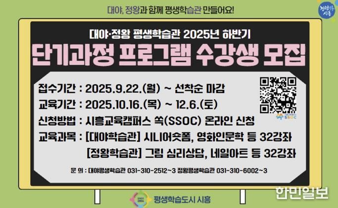 한민일보 서울포커스 유현민 기자 | 시흥시 대야 · 정왕평생학습관은 오는 9월 22일부터 2025년도 하반기 단기과정 평생학습 프로그램 수강생 모집을 시작한다. 프로그램은 10월 16일부터 12월 6일까지 약 두 달간 운영될 예정이다. 이번 프로그램은 참여형 시민 제안 프로그램으로, 수요 조사 기반 맞춤형 강좌를 마련하고, 변화하는 사회·문화적 트렌드를 적극 반영해 학습 선택의 폭을 넓힌 것이 특징이다.