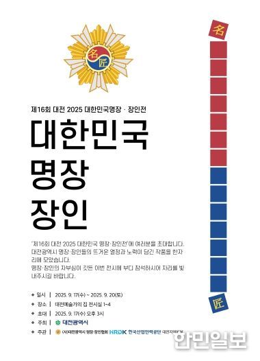 한민일보 서울포커스 유한희 기자 | 대전시는 9월 17일 수요일부터 20일 토요일까지 나흘 동안 대전예술가의 집 전시실에서 제16회 명장·장인전을 개최한다고 밝혔다. 이번 전시에는 대한민국 명장과 대전시 명장을 비롯한 지역 장인 30여 명이 참여해 인장, 전각, 화훼디자인, 석공예, 제과·제빵 등 다양한 분야의 작품 300여 점을 선보인다.