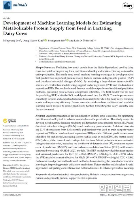 한민일보 서울포커스 기자 | 농촌진흥청은 젖소에 필요한 단백질 요구량을 인공지능으로 정밀하게 예측할 수 있는 데이터 학습(머신러닝) 기반 예측 모형(모델)을 개발했다고 밝혔다.