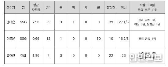 SSG 앤더슨은 9~10월 5경기에 선발 등판해 3승을 거두며 승리 부문 공동 1위에 올랐다. 평균자책점 2.96을 기록했고, 삼진 39개를 잡아내며 탈삼진 부문 월간 1위를 차지했다. 앤더슨은 9~10월 경기 당 평균 8개에 가까운 탈삼진을 잡으며 245탈삼진으로 정규시즌을 마무리했다.
