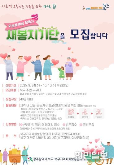 한민일보 서울포커스 박용남 기자 | 광주시 북구가 사회적으로 고립된 이웃들이 지역사회의 구성원으로서 돌아올 수 있도록 지원하는 ‘새봄지기단’에 참여할 주민을 오는 15일까지 모집한다고 9일 밝혔다.