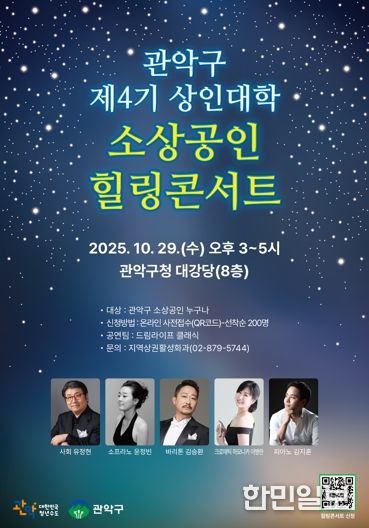 한민일보 서울포커스 곽중희 기자 | 관악구는 오는 10월 29일 오후 3시, 구청 8층 대강당에서 관내 소상공인을 위한 힐링콘서트를 개최한다.