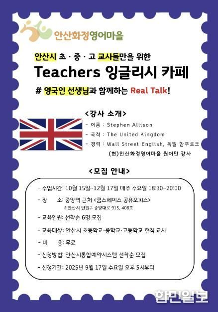 한민일보 서울포커스 임철현 기자 | 안산시 안산화정영어마을은 오는 15일부터 12월 17일까지 관내 소속 교사를 대상으로 ‘티처스(Teachers) 잉글리시 카페’를 운영한다고 10일 밝혔다.