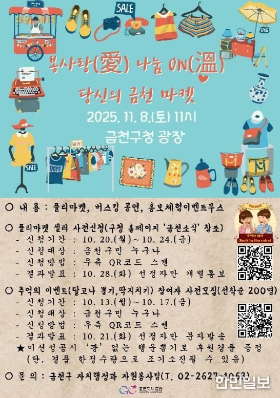 한민일보 서울포커스 곽중희 기자 | 금천구는 오는 11월 8일 금천구청 광장 앞에서 ‘봉사랑(愛) 나눔ON(溫), 당신의 금천마켓’을 연다고 밝혔다.