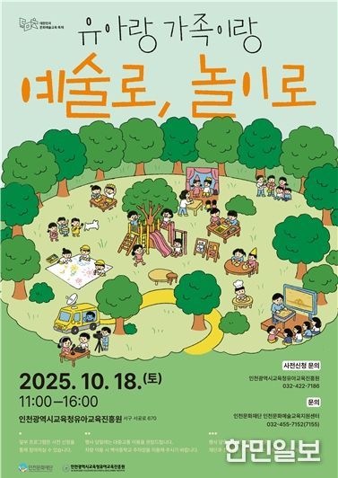 한민일보 서울포커스 유창렬 기자 | (재)인천문화재단은 인천광역시교육청유아교육진흥원과 협력하여 2025 대한민국 문 화예술교육 축제와 연계된 '유아랑 가족이랑 예술로, 놀이로' 행사를 10월 18일 오전 11시부터 오후 4시까지 인천광역시교육청유아교육진흥원에서 개최한다.