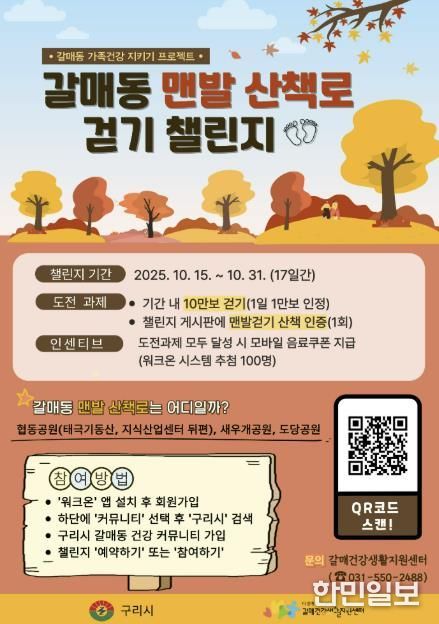 한민일보 서울포커스 김정옥 기자 | 구리시는 가을철 주민들의 건강한 생활 습관 형성과 스트레스 완화를 위해 ‘갈매동 맨발 산책로 걷기 챌린지’를 오는 10월 15일부터 31일까지 17일간 운영한다고 밝혔다.