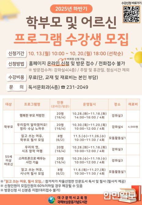 어르신 대상으로는 ▲시조를 이해하고 창작해 보는 ‘우리의 멋, 시조 창작 여행, 스마트폰 카메라 활용법’, ▲사진 편집 방법을 익힐 수 있는 ‘스마트폰으로 배우는 사진 기술’ 프로그램을 운영한다. 또한, ▲학부모 및 어르신 대상 자율 선정한 인문도서를 필사하는 ‘읽고 쓰는 여유, 필사 모임’을 진행한다.
