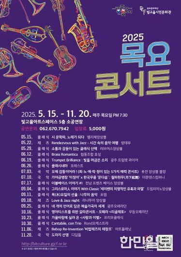 한민일보 서울포커스 박용남 기자 | 광주문화재단(대표이사 노희용)은 오는 10월 16일, 23일, 30일 목요일 저녁 7시 30분, 빛고을아트스페이스 5층 소공연장에서 ‘10월의 목요콘서트’를 개최한다고 밝혔다.