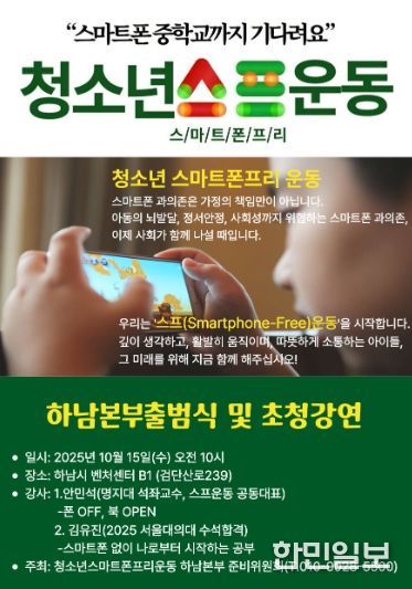 한민일보 서울포커스 유현민 기자 | 15일 오전 10시, 하남시 벤처센터에서 ‘청소년 스마트폰 프리 운동(Smartphone-Free)’ 하남본부 출범식을 갖는다.