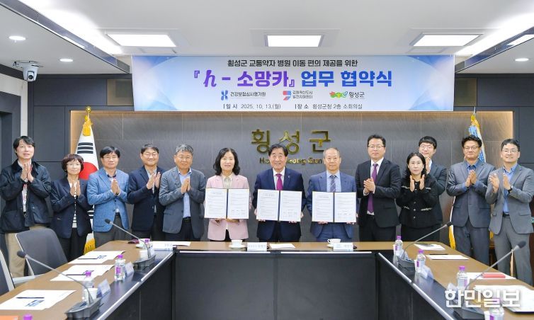 한민일보 서울포커스 곽중희 기자 | 강원혁신도시발전지원센터(센터)와 건강보험심사평가원(심평원), 횡성군은 10월 13일 횡성군청에서 의료 사각지역 교통 취약계층을 위한 병원이동용 차량 지원 사업 업무협약을 체결했다.