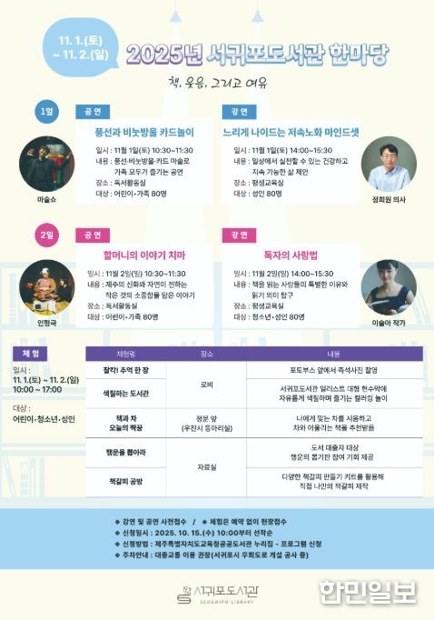 한민일보 서울포커스 임철현 기자 | 제주도교육청 서귀포도서관은 11월 1일과 2일 양일간 지역 주민이 함께 즐기는 독서문화 축제 ‘2025년 서귀포도서관 한마당’을 개최한다.