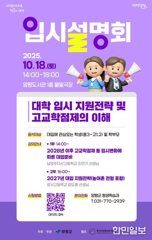 한민일보 서울포커스 차재만 기자 | 양평군은 오는 10월 18일 오후 2시, 양평도서관 물빛극장에서 관내 학생과 학부모를 대상으로 ‘2025년 양평군 대학 입시설명회’를 개최한다고 밝혔다. 이번 설명회는 대학 입시에 관심 있는 학생과 학부모에게 다양한 입시 정보를 제공하기 위해 마련됐다.