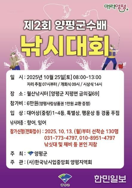 한민일보 서울포커스 차재만 기자 | 양평군은 오는 25일 관내 월산낚시터에서 ‘제2회 양평군수배 낚시 대회’를 개최한다고 밝혔다.