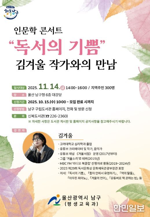 한민일보 서울포커스 기자 | 울산 남구 구립도서관은 인문학 콘서트‘김겨울 작가와의 만남’ 수강생을 모집한다.