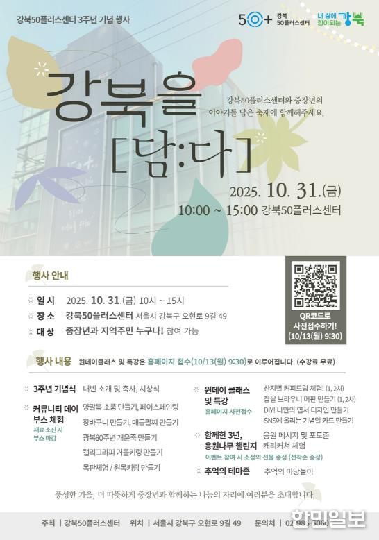 강북50플러스센터 관계자는 “이번 행사는 중장년들이 함께 웃고 나누는 따뜻한 축제의 자리로, 지난 3년의 여정을 돌아보고 새로운 출발을 다짐하는 의미를 담고 있다”며 “앞으로도 중장년층이 행복한 삶을 누릴 수 있도록 다양한 프로그램과 지원을 지속해 나가겠다”고 밝혔다.