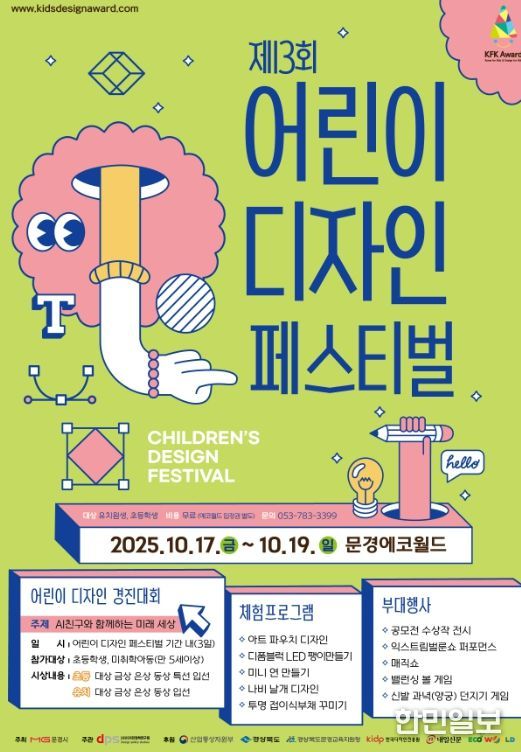 한민일보 서울포커스 김봉순 기자 | 경상북도와 문경시가 주최하고 (사)디자인정책연구원이 주관하는 제13회 대한민국 어린이제품 디자인 공모전 ‘어린이 디자인 페스티벌’이 10월 17일부터 19일까지 사흘간 문경에코월드에서 열린다.