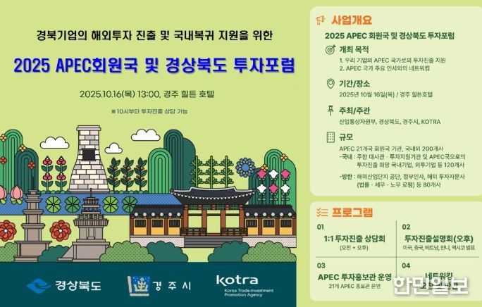 이번 포럼은 APEC 주요 회원국과 국내기업이 함께 참여하는 글로벌 투자 교류의 장으로, 경주를 중심으로 신규 투자 프로젝트를 발굴하고 경북지역 외국인 투자 활성화와 국내 복귀기업 유치를 목표로 추진된다.