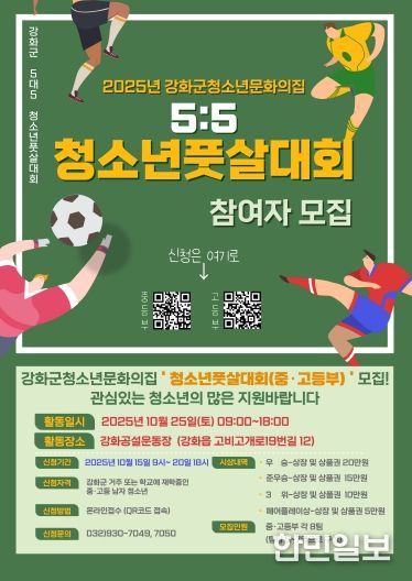 한민일보 서울포커스 최성훈 기자 | 강화군시설관리공단(이사장 박영길)에서 운영하는 청소년 문화의 집이 오는 15일~20일, 관내 중․고등 남학생을 대상으로 강화군 청소년 풋살대회 참가자(팀)를 모집한다고 밝혔다.