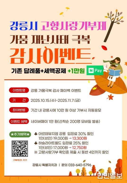 한민일보 서울포커스 임경복 기자 | 강릉시는 연말 기부 집중 기간을 맞아 고향사랑기부제 참여를 활성화하고, 지난 가뭄 극복 과정에서 전국 각지에서 보내준 따듯한 응원에 감사의 마음을 전하기 위해 “가뭄극복 감사 이벤트”를 진행한다.