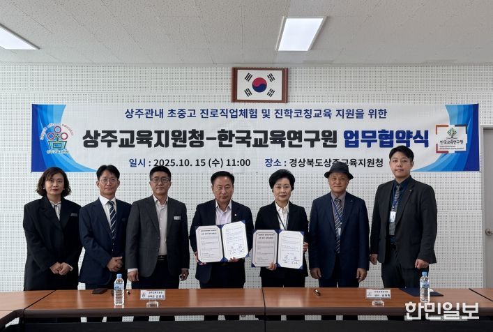 한민일보 서울포커스 김봉순 기자 | 경상북도상주교육지원청은 10. 15. 11:00, 교육지원청 2층 소회의실에서 『2025학년도 행복교육 실현을 위한 업무협약(MOU) 체결식』을 주관하고, 한국교육연구원과 함께 지역 학생들의 미래 역량 강화를 위한 공동 협력에 나섰다.