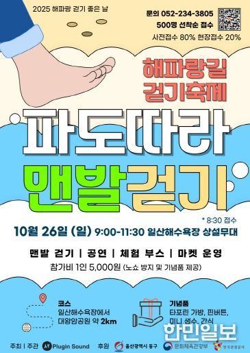 한민일보 서울포커스 기자 | 울산 동구가 오는 10월 26일 오전 9시부터 11시 30분까지 일산해수욕장 상설무대 일원에서 ‘2025 해파랑길 걷기 축제 – 파도 따라 맨발 걷기’를 개최한다.