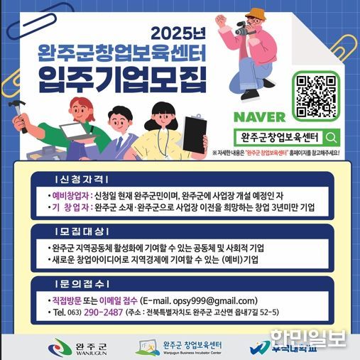 한민일보 서울포커스 박용남 기자 | 완주군 창업보육센터가 입주기업 기간 만료에 따라, 입주기업을 11월 7일까지 모집한다.