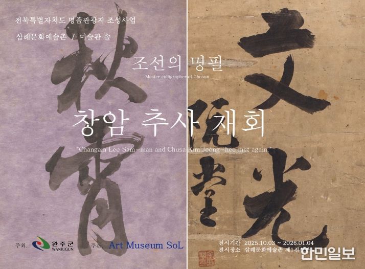 한민일보 서울포커스 박용남 기자 | 완주군이 삼례문화예술촌 제1전시관에서 조선시대를 대표하는 명필 두 인물, 창암 이삼만(蒼巖 李三晩, 1770~1847)과 추사 김정희(秋史 金正喜, 1786~1856)의 예술세계를 한자리에서 만날 수 있는 특별전 ‘창암 추사 재회’가 성황리에 열리고 있다.