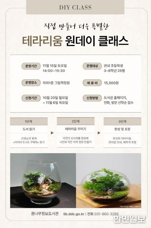 한민일보 서울포커스 임경복 기자 | 동두천시 도서문화사업소 꿈나무정보도서관은 오는 10월 20일부터 초등학교 3~6학년을 대상으로 『테라리움 만들기』 원데이 클래스를 운영한다고 밝혔다.