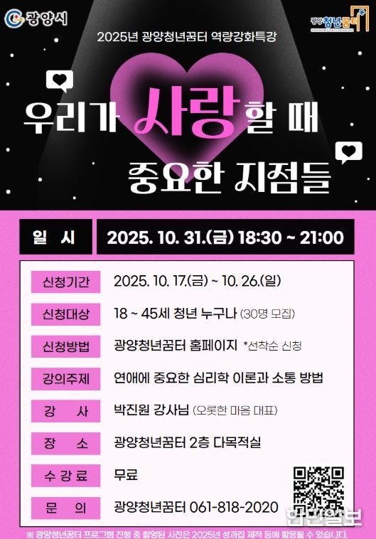 한민일보 서울포커스 임광현 기자 | 광양청년꿈터는 청년들의 건강한 관계 역량 강화와 정서적 성장을 지원하기 위해 오는 10월 31일 ‘오롯한 마음’ 박진원 대표를 초청해 연애 특강을 진행한다고 밝혔다.