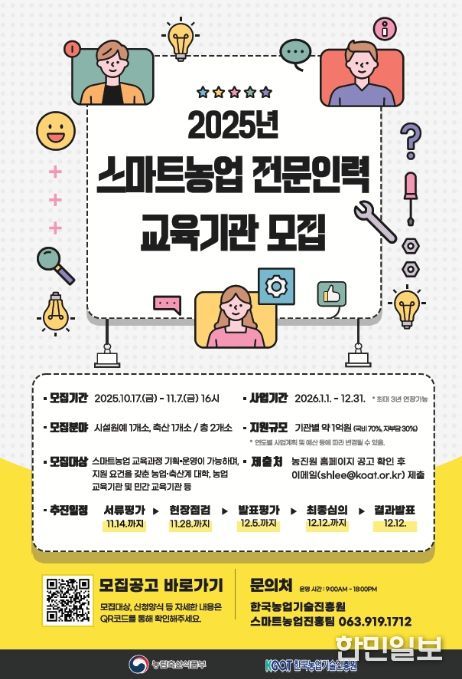 한민일보 서울포커스 기자 | 농림축산식품부는 스마트농업 분야 전문인력 양성에 대한 현장수요가 높아짐에 따라, 10월 17일부터 11월 7일까지 '스마트농업 전문인력 교육기관'을 추가 모집한다.