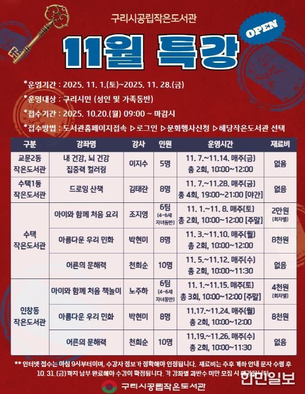 참여 신청은 10월 20일 오전 9시부터 구리시립도서관 홈페이지에서 가능하며, 구리시에 거주하는 시민 누구나 신청할 수 있다. 프로그램 관련 자세한 사항은 작은 도서관으로 문의하면 된다.
