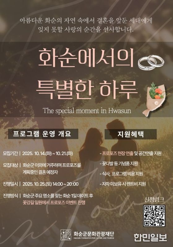 모집은 10월 14일(화)부터 10월 21일(화) 18:00까지로 화순군 외 지역에 거주하며 프로포즈를 계획 중인 커플 1팀을 모집한다. 신청은 별도의 폼 작성을 통한 온라인 접수로 가능하며, 최종선정자는 10월 22일(수) 개별 안내 예정이다.