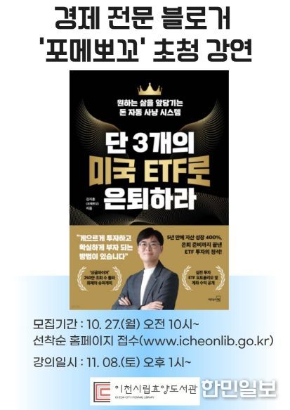 한민일보 서울포커스 박용남 기자 | 이천시 효양도서관은 시민들의 경제적 이해력 향상과 현명한 자산 관리 능력 제고를 위해 오는 11월 8일 오후 1시, '단 3개의 미국 ETF로 은퇴하라'의 저자이자 네이버 경제 전문 블로거 김지훈(필명 포메뽀꼬)을 초청해 재테크 특강을 진행한다.