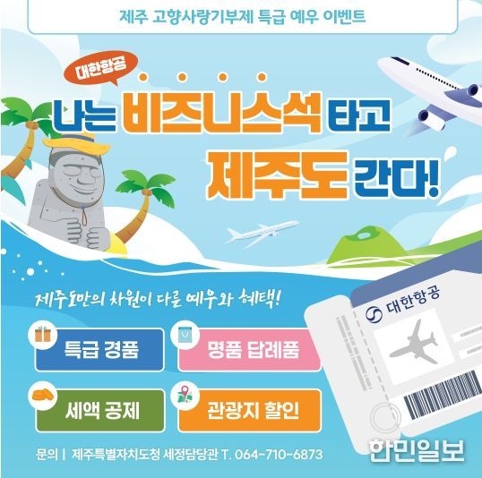 한민일보 서울포커스 임경복 기자 | 제주특별자치도가 제주 고향사랑 기부자에게 제주-김포 왕복 비즈니스석 항공권 등 특별한 선물을 제공한다.
