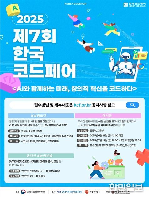 한민일보 서울포커스 기자 | 과학기술정보통신부는 광주광역시, 한국지능정보사회진흥원(원장 황종성)과 함께 청소년들의 인공지능(AI)·소프트웨어(SW) 학습 동기부여와 역량 강화를 위한 '제7회 한국코드페어' 본선 대회를 10월 17일과 10월 18일 양일간 김대중컨벤션센터(광주광역시 서구 소재)에서 개최한다.
