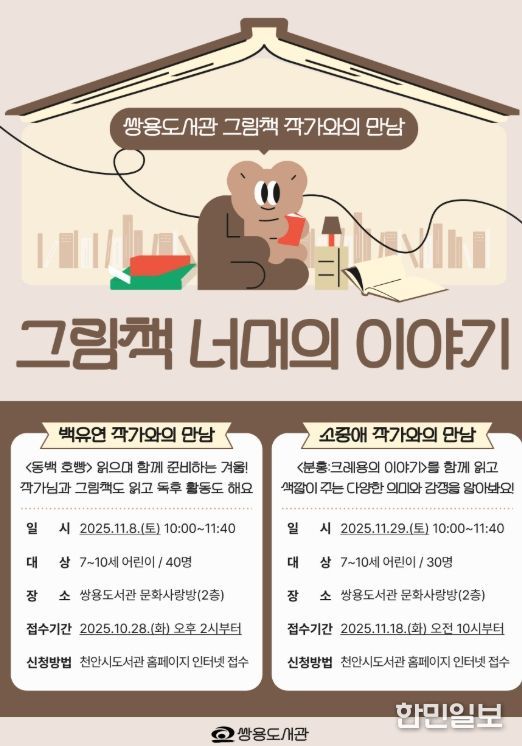 한민일보 서울포커스 황준형 기자 | 천안시 쌍용도서관은 내달 어린이들을 위한 작가 초청 프로그램 ‘그림책 너머의 이야기’를 운영한다고 17일 밝혔다.