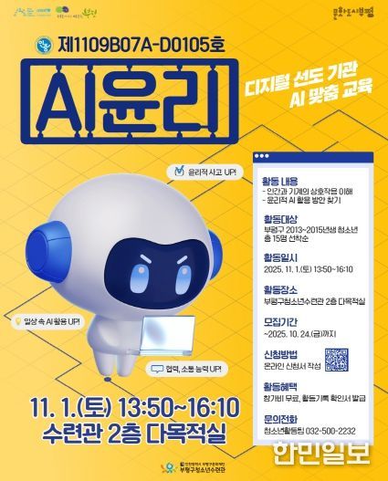 한민일보 서울포커스 김성혜 기자 | 부평구 청소년수련관은 오는 24일까지 부평 내 11~13세 청소년을 대상으로 ‘AI 윤리’ 참가자를 모집한다.