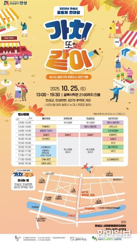 한민일보 서울포커스 임경복 기자 | 안성시는 오는 2025년 10월 25일, 안성시내 일원(안성교~안성천변~안성천~6070 추억의거리)에서 2025 안성시 공동체 한마당 ‘가치 또 같이’ 를 개최한다.