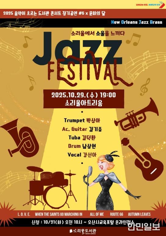 한민일보 서울포커스 임경복 기자 | 경기도 오산시는 오는 10월 29일 오후 7시, 소리울도서관 3층 소리울아트리움에서 '2025 음악이 흐르는 도서관 콘서트 정기공연 #6 × 문화의 달 – Jazz Festival; 소리울에서 소울을 느끼다'를 개최한다고 밝혔다.